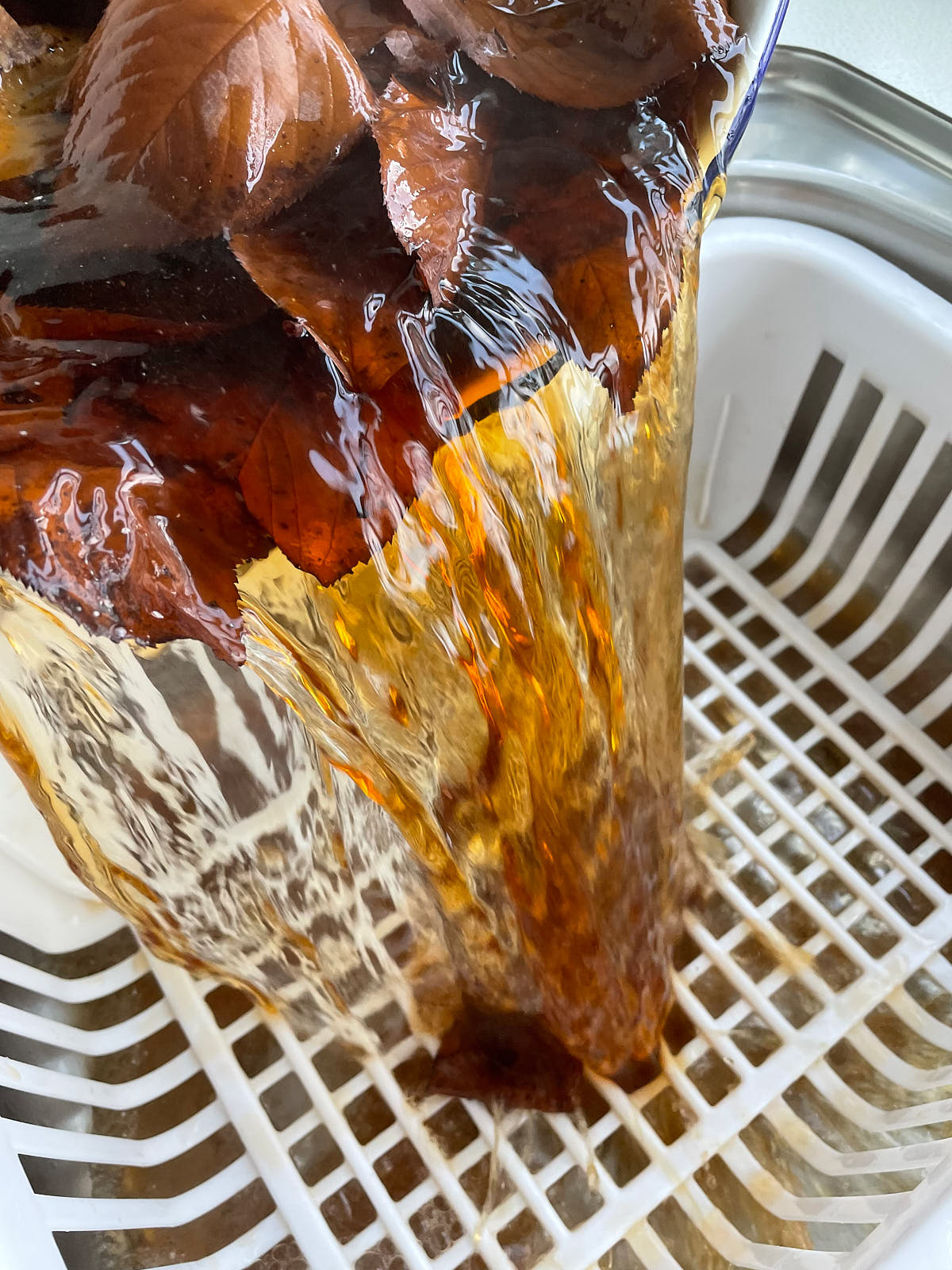落ち葉は 洗って水を入れたバケツの中に浸しておきます(アクで水が茶色に)