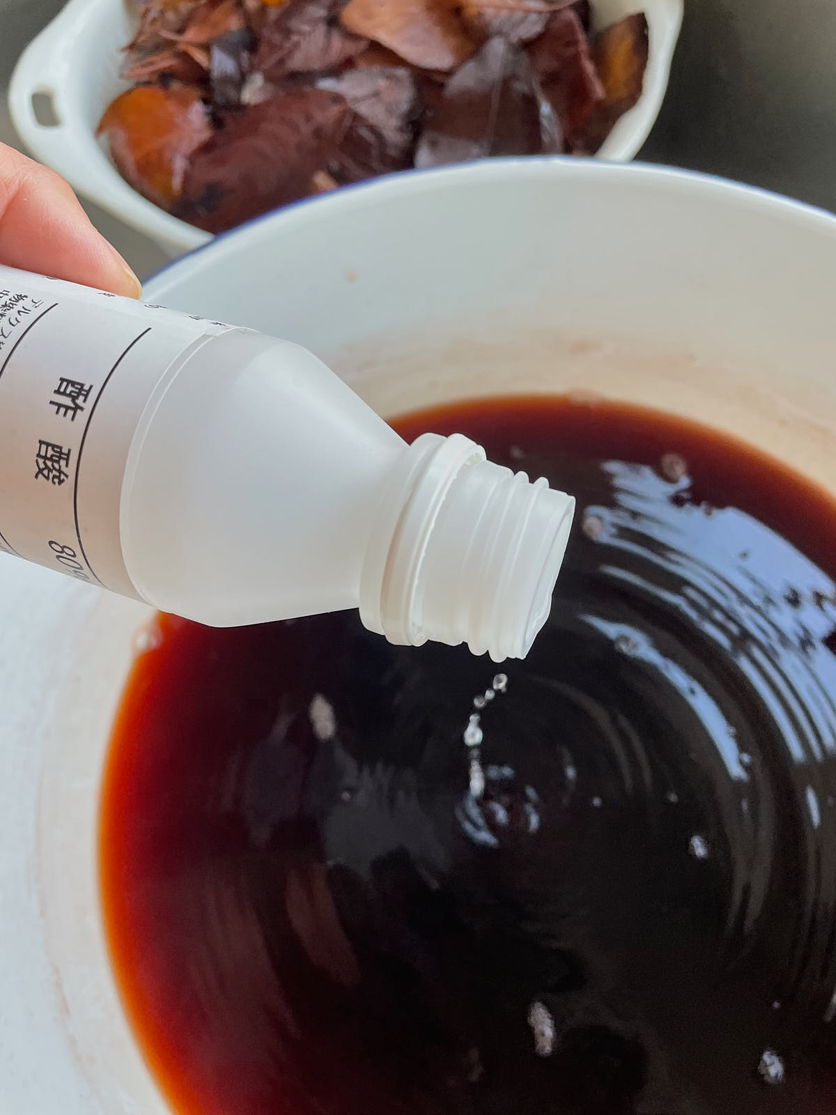 中火の火にかけ、沸騰したら火を弱め30分位煮込むと、ワイン色・・・