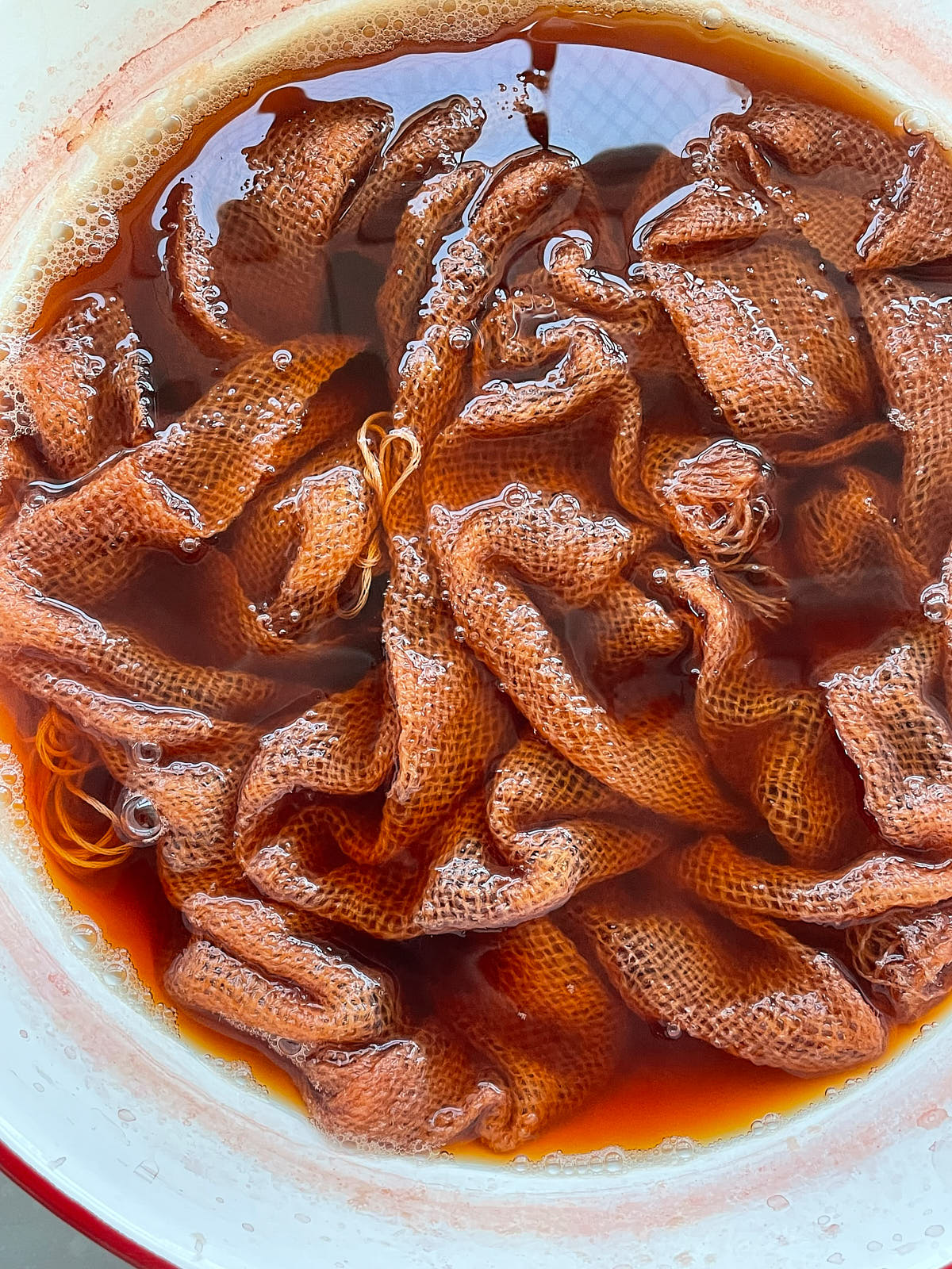 ③3回目は赤みの染め液にするために、水にソーダ灰を加えたアルカリ水の中で落ち葉を煮込みます